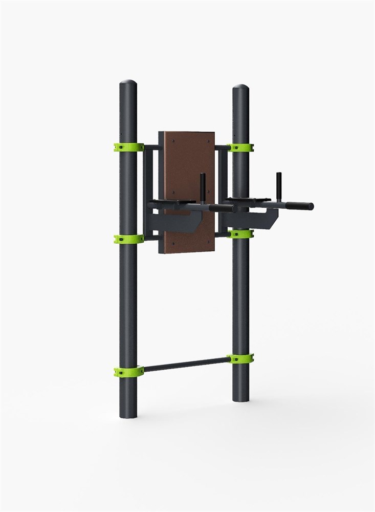 Оборудование состоит из двух вертикальных опорных столбов, трех перекладин и вертикальной стойки с упорами для рук и спины.