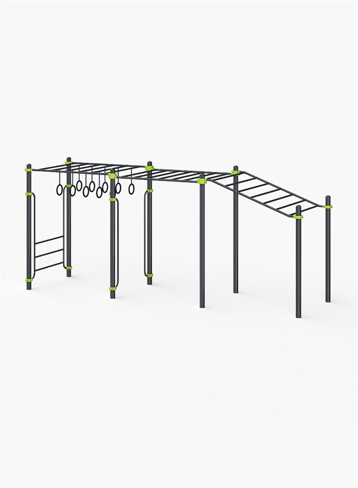 Оборудование предназначено для эффективной тренировки плечевого пояса, мышц спины и груди. Комплекс состоит из восьми вертикальных опорных столбов, секции рукохода с кольцами на подвесах, секции горизонтального рукохода, одной секции наклонного рукохода, одной малой шведской стенкой и двух вспомогательных рукояток для инвалидов и лиц с ограниченными возможностями здоровья. - Опорные столбы выполнены из стальной трубы Ø108мм с толщиной стенки 3мм длиной 3300мм -6шт. длиной 2800мм -2шт.
