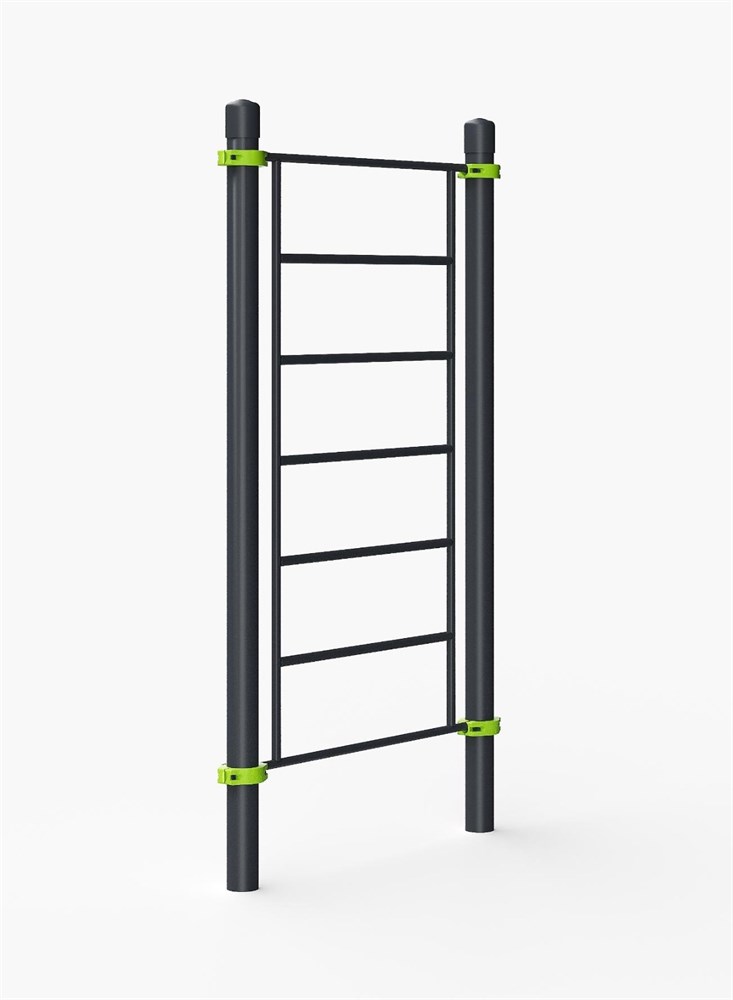 Оборудование состоит из двух вертикально опорных столбов и металлического элемента «Шведская стенка».