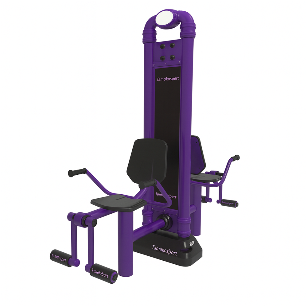 Уличный тренажёр "Для коленных суставов двойной" от TamokoSport — предназначен для тренировки мышц ног путём разгибания и сгибания в коленных суставах в сидячем положении.